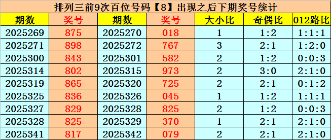百位号码:百位上期奖号为2路、偶数、大号:8,历史上百位号码8共开出792期,前一次开出期数在第2025341期,上期奖号隔4期再次开出。