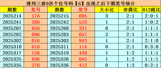 个位号码:上期奖号为大号、偶数、0路号码:6,历史上个位号码6共开出738期,前一次出现时第2025335期,上期遗漏10期再出。