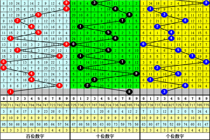 在百位前9次出现号码8之后,下期百位分散开出奖号:0-7-5-9-7-0-8-3-0,其中开出号码个数奇偶比是5:4,大小比是5:4,012路比是5:2:2。